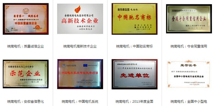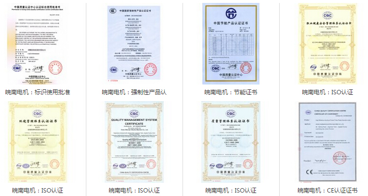 皖南電機(jī)堅(jiān)持管理創(chuàng)新,大力實(shí)施“精品工程戰(zhàn)略”,建立有完善的質(zhì)量控制和管理體系,先后通過(guò)了ISO9001質(zhì)量管理體系認(rèn)證、ISO14001環(huán)境管理體系認(rèn)證、OHSAS18001職業(yè)健康安全管理體系認(rèn)證,CQC、CCC認(rèn)證, 歐盟CE、美國(guó)UL和加拿大CSA認(rèn)證,中國(guó)國(guó)家高效認(rèn)證、低碳認(rèn)證,美國(guó)能源部CC高效等多項(xiàng)認(rèn)證。